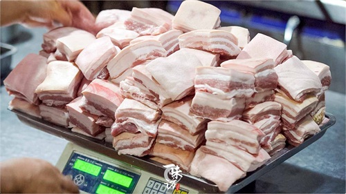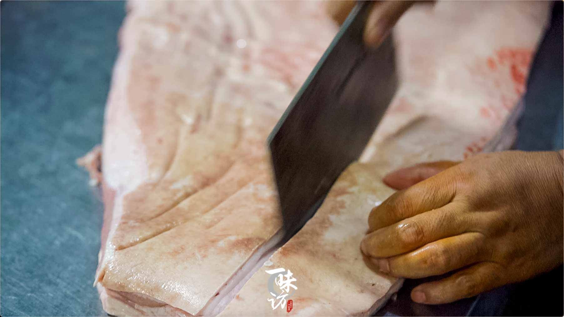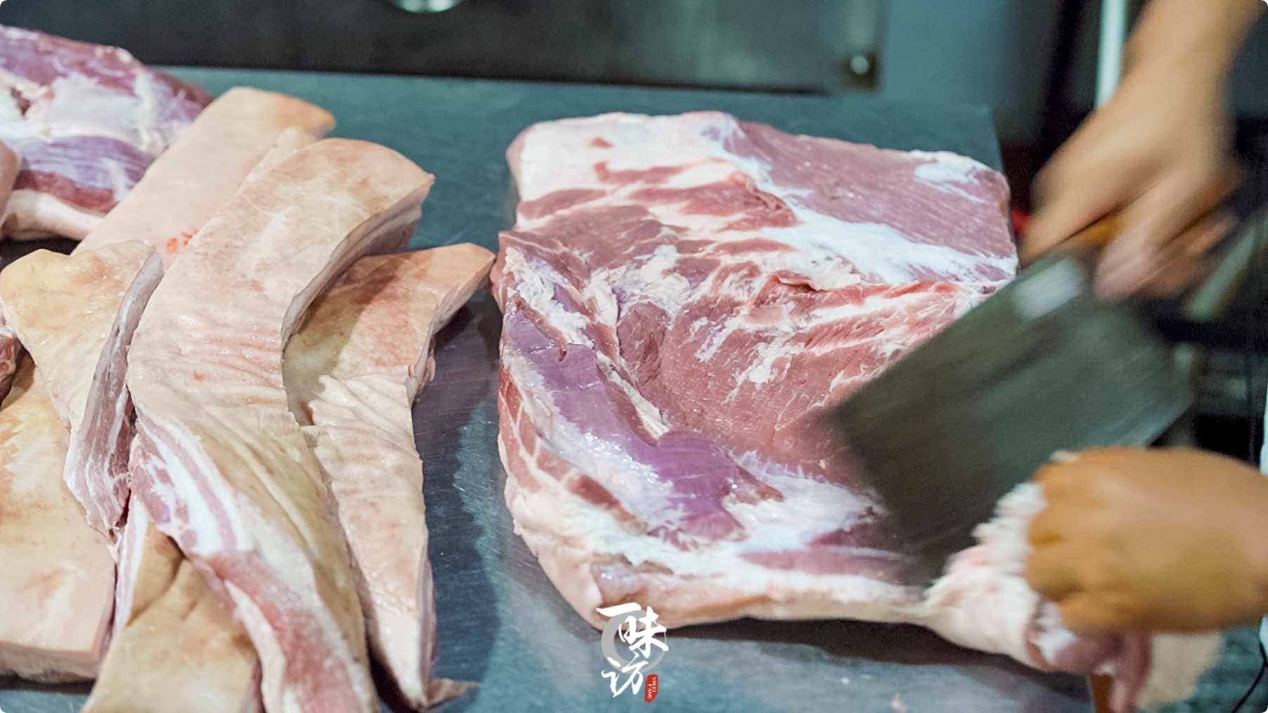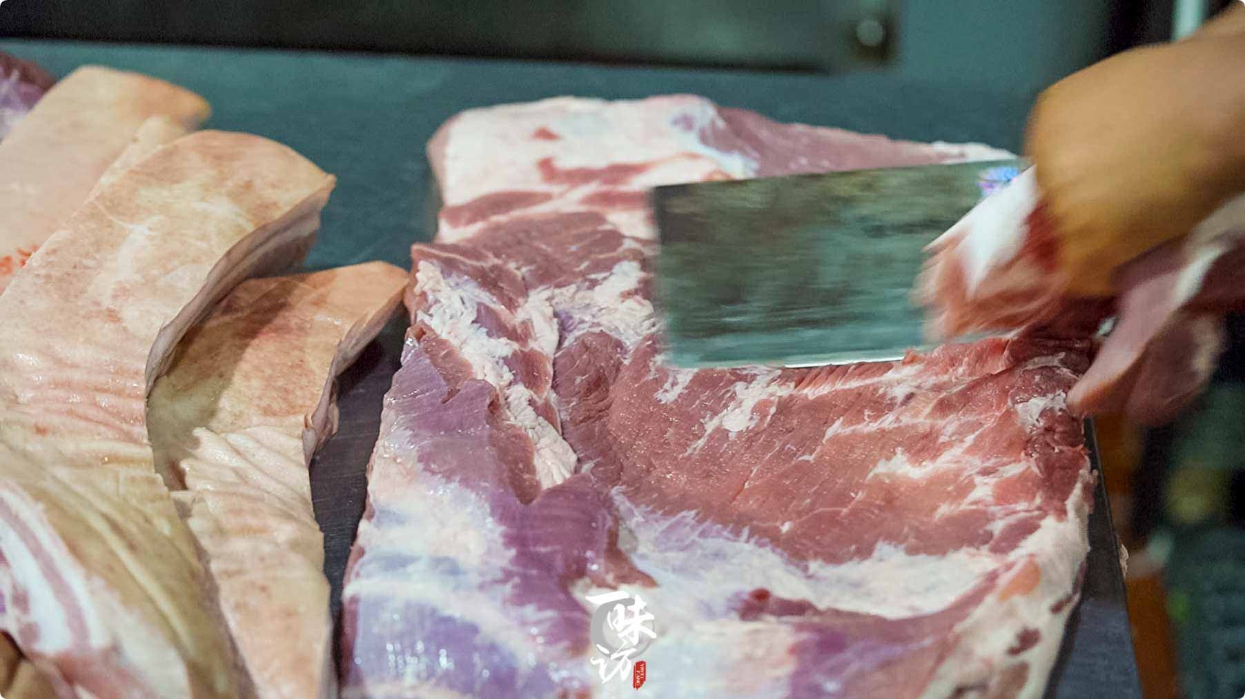 购买整片的猪肉进行改刀,把比较厚的地方进行改刀,尽量把整片的肉都改一样的平为主。