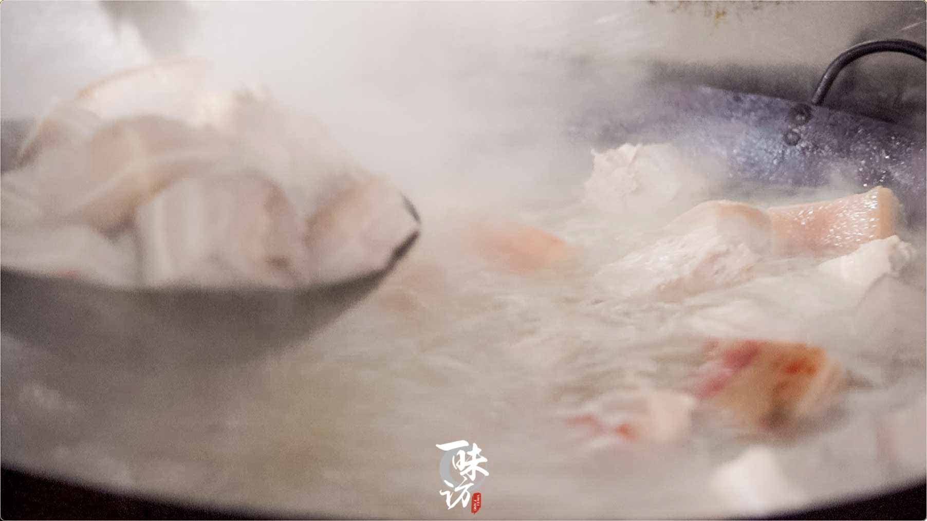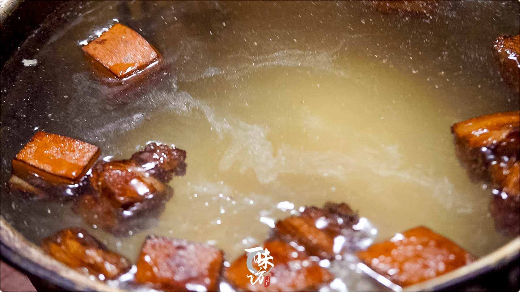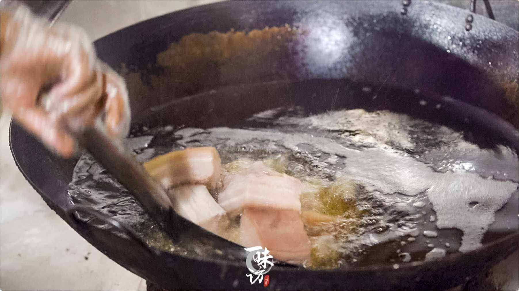 把炸好的五花肉块放入冰水中进行热胀冷缩的作用,这样的肉质吃起来紧实好吃。