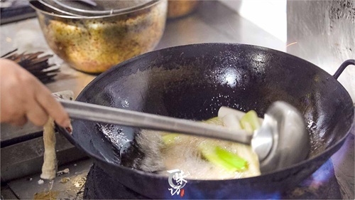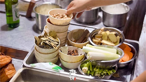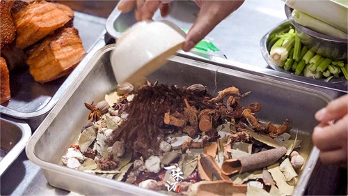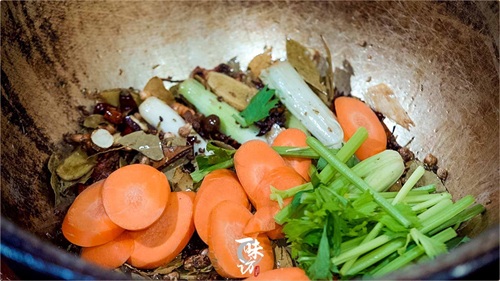 香料炒香以后再再放入胡萝卜1300克和芹菜250克等增香蔬菜,增加料水的香味。