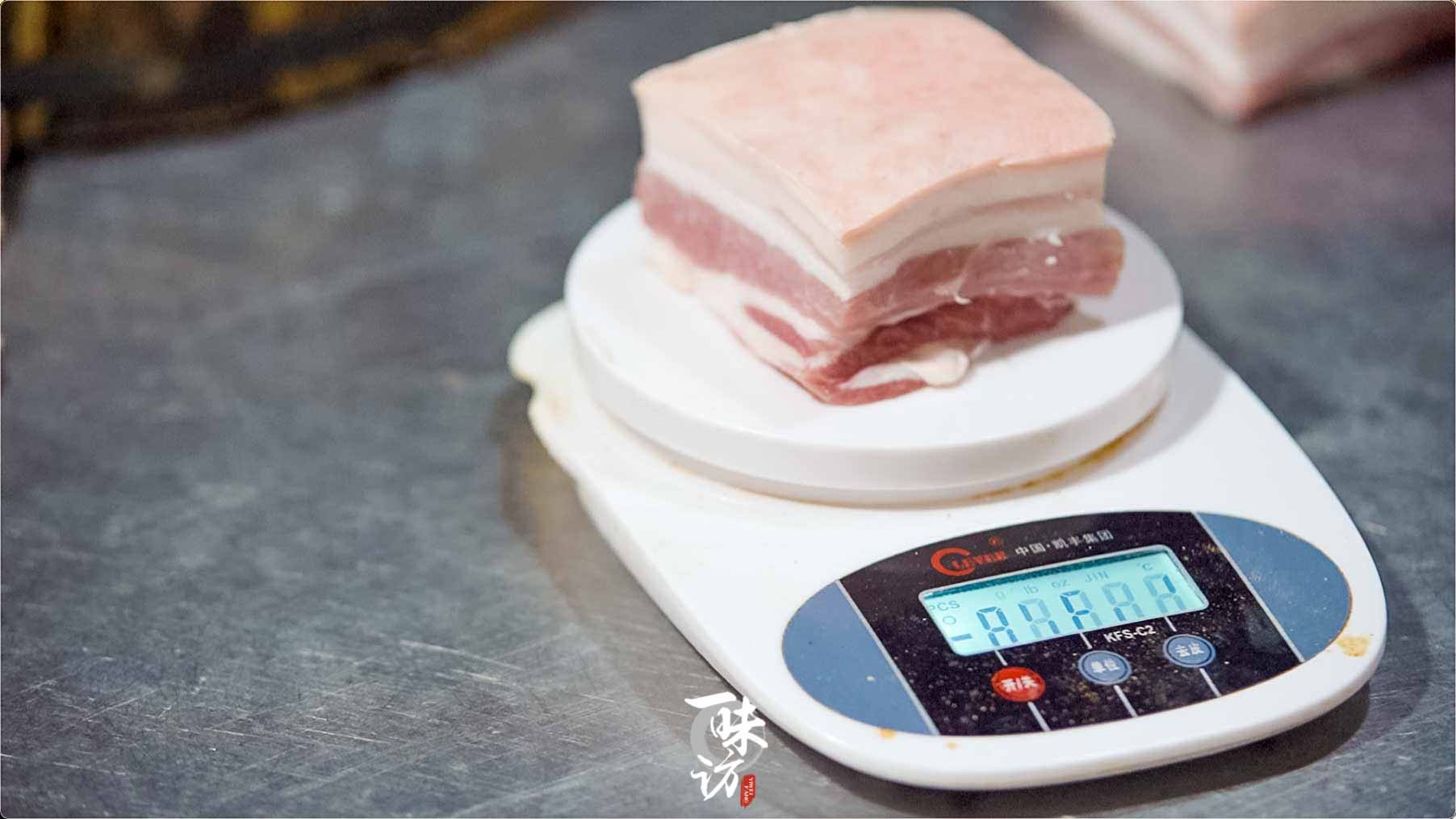 改完刀的五花肉我们进行改刀成块,黄焖肉的肉一定要大块,改刀一块差不多在300克左右,这样做起来的肉软烂入口。