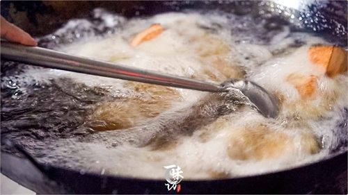 准备一个大锅下入适量的色拉油,然后把沥干水分的肉下入油锅中进行炸制,主要的目的就是把多余的油脂炸出去,不然吃起来就比较油腻。