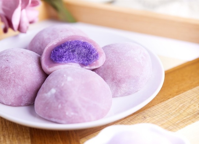 做法:紫薯去皮,切成2厘米大小的小块,开水煮熟,煮过的水千万不要倒掉。趁热加入炼乳,用勺子反复碾压搅拌,至糖全部融化,紫薯成泥。如果太湿润可以放微波炉热几分钟,蒸发多余的水分。黄油加热成液体,糯米粉、玉米淀粉、细砂糖,加入200g煮过紫薯的水,调出浓稠的面糊,搅拌至无颗粒。最后倒入黄油,搅拌至完全融合。开水上锅蒸10-15分钟,用筷子戳面团的底部,全部是半透明的颜色就蒸熟了。把面团搓长条,分成每个35g的小份,团光滑。糯米皮压扁,包入紫薯馅,紫薯馅每个20g,最后均匀地裹上一层糯米粉就好啦。吃起来软软糯糯的,好吃但是不腻,真的是一种入口即化的感觉,超好吃。