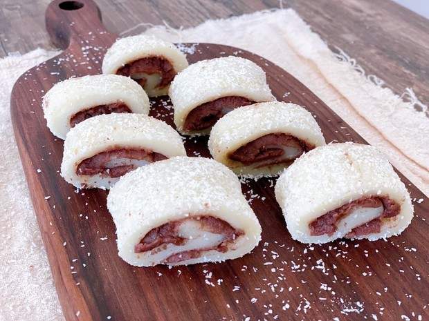 做法:将糯米粉、玉米淀粉、糖、牛奶倒入碗中搅拌至糊状。把拌匀的面糊用保鲜膜封好,保鲜膜上扎孔,放锅里隔水中火蒸20分钟左右,要时时照看,防止锅里的水烧完,也要防止面糊过熟,不然就成高了。蒸熟后再放上黄油,用余热将其融化。戴上一次性手套,将糯米团揉搓成一个光滑的面团。砧板和擀面杖覆上保鲜膜,擀成长方形,不要太厚,再铺上豆沙。卷起来,裹上一层椰蓉后切块就可以了。说实话,这个有点像驴打滚,但是我觉得比驴打滚好吃,软糯不粘牙,超级美味!