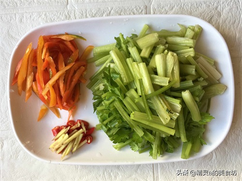 3:洗净的香芹切段,红椒去籽切细丝,小米椒生姜切碎末。