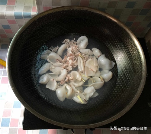 4:坐锅烧水,水开后下腌好的小鱿鱼,焯烫20秒左右,捞起控干水分。