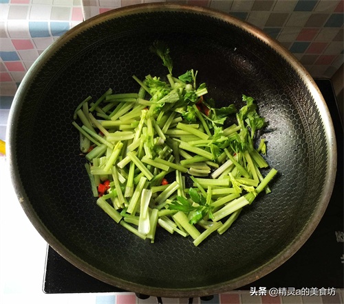6:下香芹段,翻炒2分钟左右,芹菜断生。
