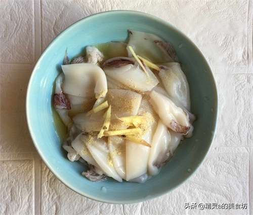 2:小鱿鱼,清理眼睛,软管,黑膜,还有吸盘等部分,然后放碗中,加入料酒,胡椒粉和一些姜丝,拌匀腌制5分钟。